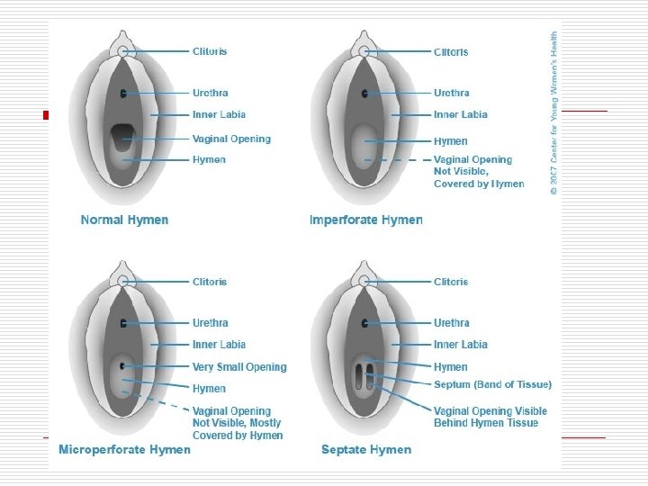o Gld. Vestibularis majoris Bartholini n Mengeluarkan sekret mucus terutama pada waktu coitus o Hymen n n Lapisan tipis menutupi introitus vaginae Bisanya berlubang sebesar ujung jari Bila tertutup: hymen occlusum Setelah partus tinggal sisa kecil pd pinggir introitus: caruncula myrtiformis