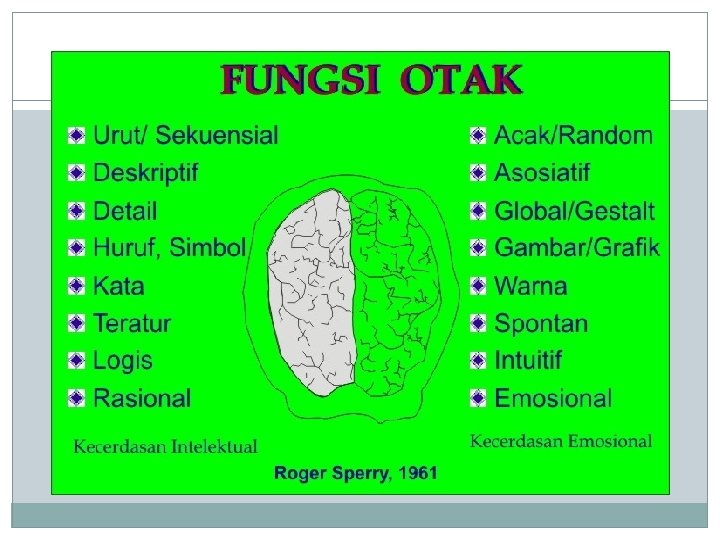 Cara kerja otak manusia Otak bekerja sama dengan organ tubuh kita lainnya sehingga tubuh kita bisa bekerja sesuai perintahnya. Otak dan Sum-sum tulang belakang membentuk sistem syaraf pusat, kedua sistem ini bekerja sama untuk mengkoordinasikan seluruh kegiatan tubuh. Saat anda berpikir keras cerebrum (hemisfer) berfungsi untuk mengingatnya, menganalisa, sehingga muncul ideide kreatif (hemisfer kanan). Untuk logika dan bicara di gunakan hemisfer kiri. Batang otak berfungsi untuk kebutuhan-kebutuhan dasar dari organ tubuh seperti mengatur denyut jantung, bernapas, sistem pencernaan, sirkulasi darah dan merasakan kapan kita terbangun maupun tertidur.