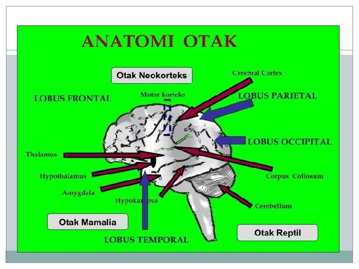 Otak �Otak (bahasa Inggris: encephalon) adalah pusat sistem saraf pada vertebrata dan banyak invertebrata lainnya. �Otak mengatur dan mengkordinir sebagian besar, gerakan, perilaku dan fungsi tubuh homeostasis seperti detak jantung, tekanan darah, keseimbangan cairan tubuh dan suhu tubuh. Otak juga bertanggung jawab atas fungsi seperti pengenalan, emosi. ingatan, pembelajaran motorik dan segala bentuk pembelajaran lainnya. �Otak terbentuk dari dua jenis sel: glia dan neuron. Glia berfungsi untuk menunjang dan melindungi neuron. �Otak manusia adalah struktur pusat pengaturan yang memiliki volume sekitar 1. 350 cc dan terdiri atas 100 juta sel saraf atau neuron.
