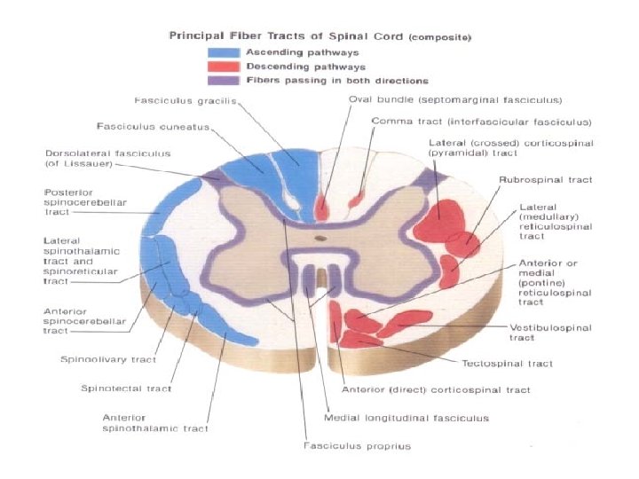 SERABUT DI MEDULLA SPINALIS v Serabut-serabut yg akhiran, asal dan fungsi sama disebut: Tractus v Serabut-serabut di daerah tertentu disebut: Funiculus q Nama: 1). Disebut berdasarkan asal dan akhirannya Misalnya tractus corticospinalis 2). Disebut berdasarkan lokasinya Misalnya fasciculus dorsolateralis 3). Disebut berdasarkan orang yg pertama kali memperkenalkannya Misalnya fasciculus dorsolateralis tersebut no. 2 disebut dng tractus Lissauer