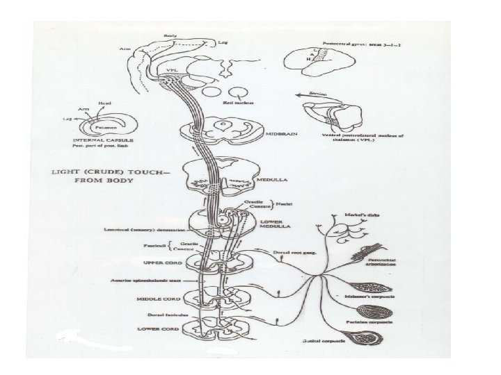 (3). LINTASAN PROPRIOCEPTIVE SPINALIS • A. KE CORTEX CEREBRI • NEURON I: Sel di ganglion spinale fun. posterior • NEURON II: Sel di nucl. fun. gracilis/cuneatus ser. arcuatus internus, (menyilang) membentuk dec. lemnisculorum lemniscus medialis • NEURON III: Sel di nucleus anteroposterolateralis thalami Radiatio thalamicus Cortex cerebri (area 3, 1 dan 2)