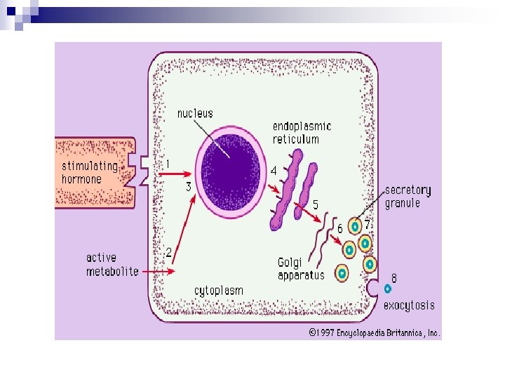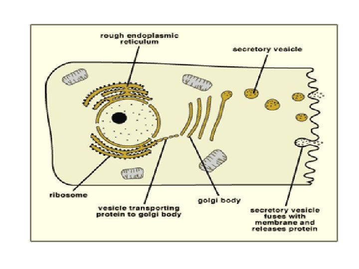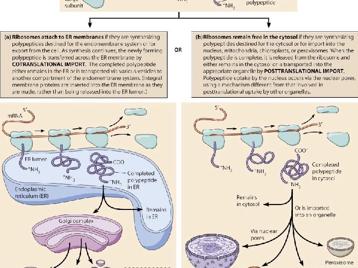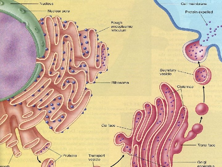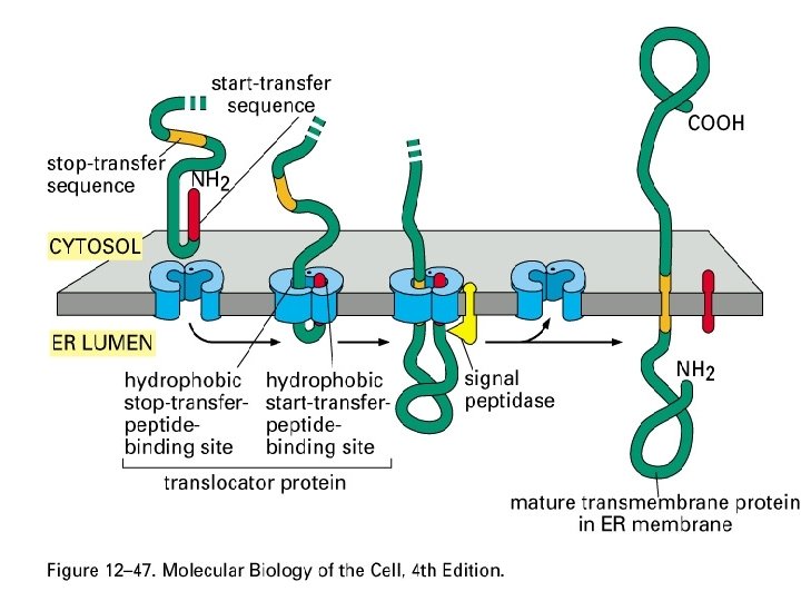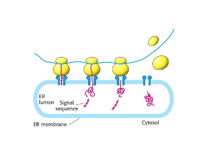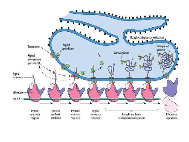 • Pemindahan rantai polipeptida ditentukan oleh kodon polipeptida isyarat (srp= signal recognition particle). Penerjemahan berlangsung di sitosol. SRP akan menuju reseptor di RE, yaitu riboforin dan mengikatkan diri. Kemudian polipeptida SRP akan mengalami pemotongan. • Selanjutnya sintesis protein berlangsung. • Protein yg disintesis di RE akan ditranspor ke Golgi, dan umumnya mengandung rantai oligosakarida.