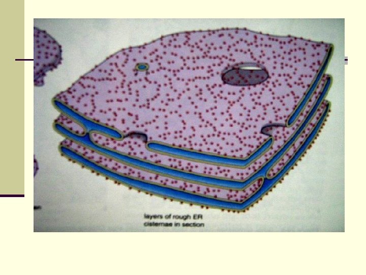 Struktur RE: n Terdiri dari 2 bagian yaitu: Retikulum endoplasma granular (REG), merupakan tumpukan sisterna yg berupa lembaran. Pada permukaan sitosolik ditempeli ribosoma (tidak pada permukaan luminal). Penempelan ribosoma pada riboforin. n Retikulum endoplasma agranular (REA), berupa anyaman saluran-saluran halus yg berbentuk visikular dan tubular. n Perbandingan protein : lipida pada selaput RE > selaput sel. Kadar kolesterol selaput RE < selaput RE lebih stabil dan kental. n Asam lemak fosfolipida selaput RE lebih pendek dan banyak yg tidak jenuh perpindahan ke arah lateral lebih mudah.