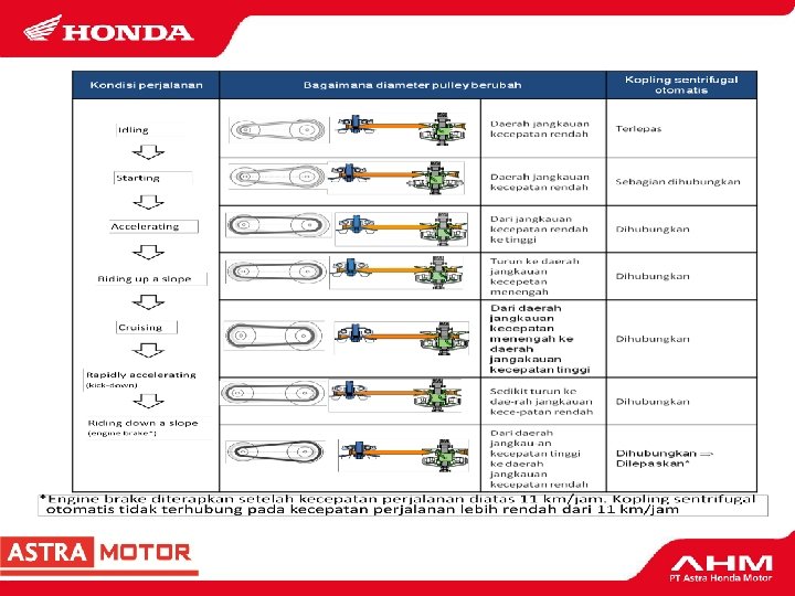 Sistem Transmisi Otomatis (V-Matic) ¿Bagaimana diameter pulley berubah mengikuti kondisi perjalanan Menjelajah Berakselerasi (kick-down) Menuruni tanjakan (engine brake) Menaiki tanjakan Berakselerasi Mulai berjalan Berhenti stasioner