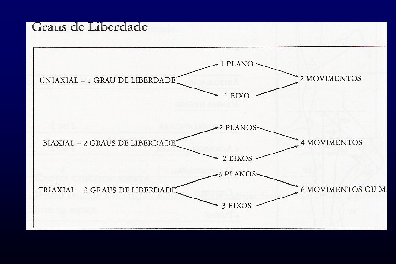 GRAUS DE LIBERDADE -As articulações estão classificadas também de acordo com o número de planos e eixos nos quais se movem. • • MONOAXIAL OU UNIAXIAL (1 grau de liberdade) BIAXIAL (2 graus de liberdade) TRIAXIAL OU MULTIAXIAL (3 graus de liberdade) OBS: As articulações NÃO-AXIAIS ou ANAXIAIS só permitem os movimentos de deslizamento ou a torção. Ex: as clássicas são as intercarpianas, intertarsianas e a coluna vertebral (vértebras).