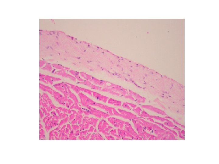 Endocardio • Se continua con la túnica intima de los vasos sanguíneos que llegan y salen del corazón. Se compone de un endotelio, que es un epitelio escamoso simple y una capa subyacente de tejido conectivo fibroelastico con fibroblastos dispersos.