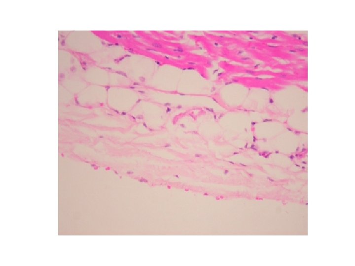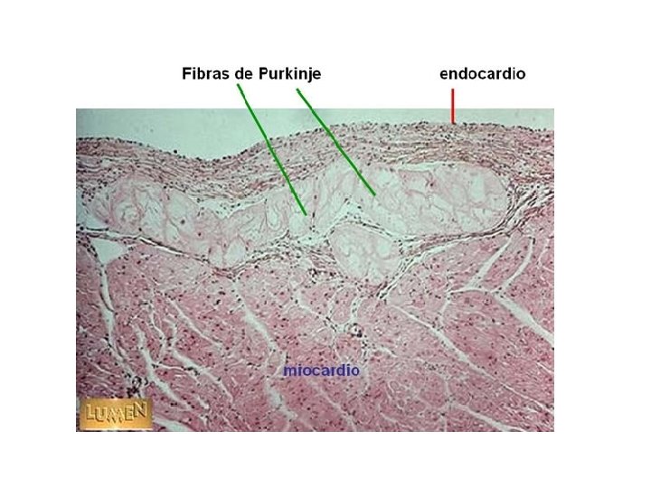 • Más abajo yace una capa de tejido conectivo denso que contiene abundantes fibras elásticas entremezcladas con células de musculo liso. En lo profundo, al endocardio se encuentra una capa subendocardica de tejido conectivo laxo que contiene vasos sanguíneos pequeños, nervios y fibras de Purkinje del sistema de conducción del corazón.