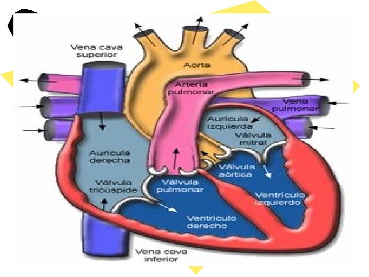 Recorrido de la sangre en el corazón • La sangre llega procedente de todo el cuerpo por las venas cavas desembocan en el corazón en la aurícula dcha, pasa al ventrículo derecho y de allí sale por la arteria pulmonar, a la aurícula izqd llega la sangre procedente de los pulmones a través de las venas pulmonares, pasa al ventrículo izqd y sale por la arteria aorta.