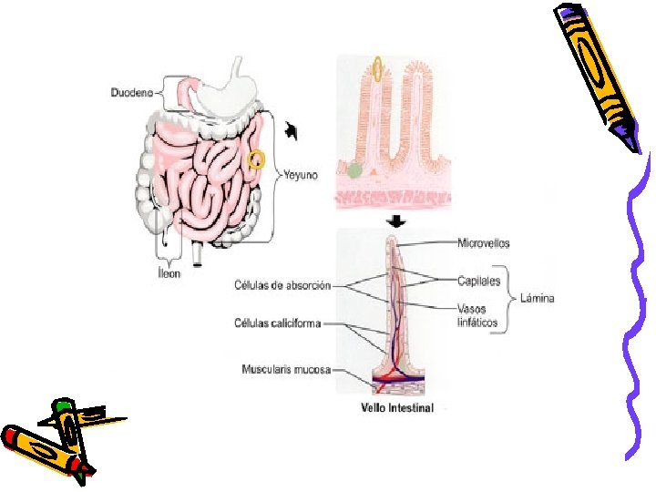 Digestivo y nutrición • El sist digestivo se encarga de transformar las complejas moléculas que forman los alimentos en nutrientes solubles. Cuando las moléculas llegan al intestino atraviesan las paredes y pasan al interior de la sangre que circula por los capilares que lo rodean.