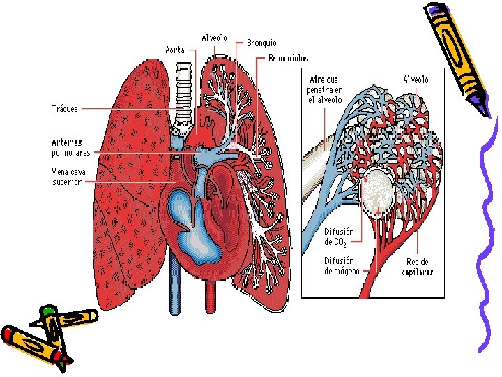 Respiratorio y nutrición • Las células necesitan oxígeno. En el metabolismo celular se produce dióxido de carbono que expulsamos al aire. En los alvéolos el oxígeno del aire pasa a la sangre y el dióxido de carbono pasa al aire procedente de la sangre.