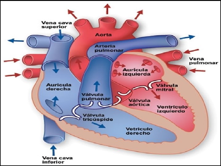 En el interior del corazón se encuentran cuatro cavidades: dos aurículas y dos ventrículos. Estas están conectadas entre sí mediante válvulas. La que conecta al ventrículo izquierdo con la aurícula izquierda se llama válvula mitral o bicúspide, y la que comunica al ventrículo derecho con la aurícula derecha se llama válvula tricúspide. Las válvulas están formadas por dos y tres membranas, respectivamente, que se encuentran conectadas a las paredes del corazón. El corazón está conectado a los vasos sanguíneos, que son los tubos por los que circula la sangre. Son de tres tipos: arterias, venas y capilares.