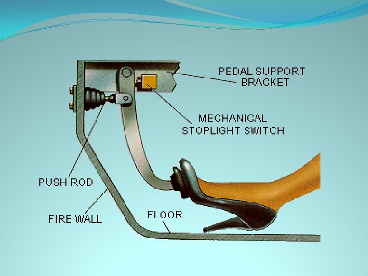 Pedal de FRENO Pieza metálica que transmite la fuerza ejercida por el conductor al sist. hidráulico. Con el pedal conseguimos hacer menos esfuerzo a la hora de transmitir dicha fuerza. El pedal de freno forma parte del conjunto “ pedalera ”, donde se sitúan 2 o 3 palancas de accionamiento individual que nos permiten manejar los principales sistemas del vehículo.