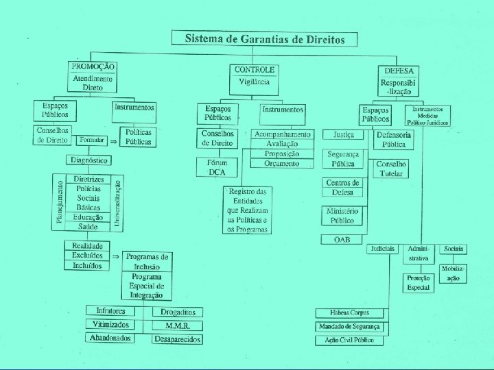 SISTEMA DE GARANTIA E DEFESA DE DIREITOS • Construção da igualdade da organização política da sociedade através dos espaços públicos institucionais • Dever do Estado, da família, da sociedade civil e dos indivíduos: compromisso e solidariedade • Responsabilidade pela correção dos desvios da realidade social, econômica e política