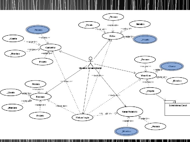Editar Projeto § Operação que edita um registro de Projeto no sistema § Precondição: • Existir um usuário com acesso de administrador • Existir o Projeto cujo registro será alterado § Pós-condição: • A alteração dos da Pessoa no Banco de Dados § Entrada Informações sobre o Projeto