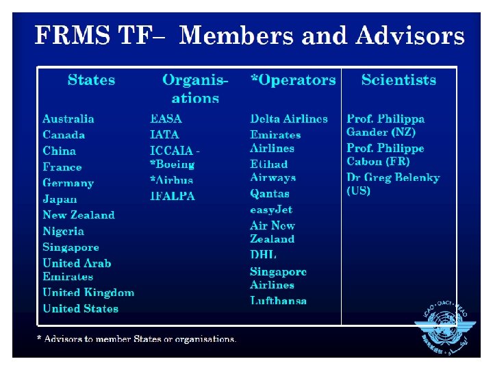COMO A ICAO DESENVOLVEU AS RECOMENDAÇÕES PARA O FRMS? Subgrupo / Limite de tempo de voo (2003 -06); Subgrupo / FRMS (2006 -08); Subgrupo / FRMS propõe a introdução do FRMS no anexo 6 através de um documento (2008); • FRMS / Força-tarefa (2009 -11).