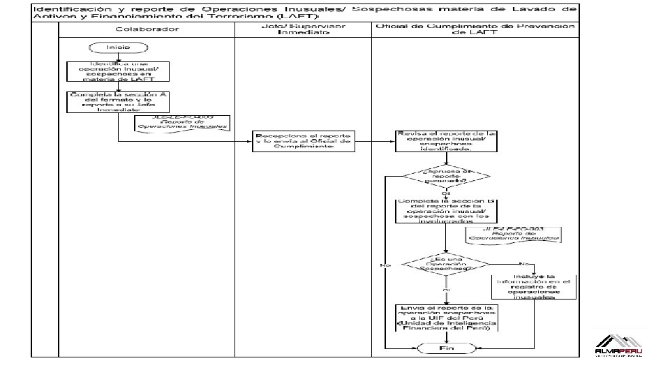 ¿ A QUIÉN REPORTO CUALQUIER TRANSACCIÓN INUSUAL ? Cualquier actividad que para ti resulte Inusual debes reportarla directamente a nuestro Oficial de Cumplimiento, Sra. María del Pilar Pineda Arbulú o a tu Jefe Inmediato; Correo: MPINEDAA@ALMAPERU. COM. PE Cual es la labor del Oficial de Cumplimiento? Es la persona natural que colabora en la implementación del Sistema de Prevención del LAFT y es responsable de vigilar su funcionamiento, además de actuar como interlocutor ante la UIF-Perú, reportando operaciones sospechosas (ROS)