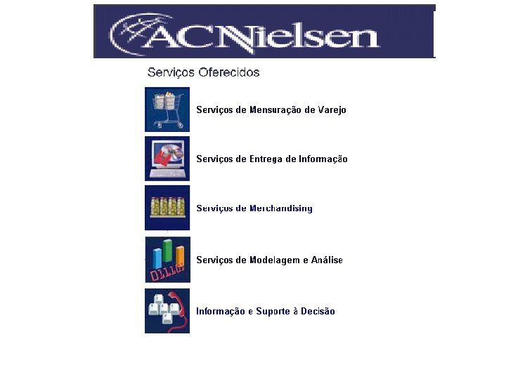 Serviços de Mensuração de Varejo - Painéis Índice ACNielsen de Varejo Observador Scantrack Varejistas Store A amostra ACNielsen abrange 86% da população brasileira, representando 91% do potencial de consumo. Para reportar a informação das áreas cobertas, o país é dividido em sete grandes regiões, que se denominam “Áreas ACNielsen”. O Observador® 2002 é o estudo de distribuição ACNielsen que tem como principal benefício a informação sobre a presença dos produtos e o material de merchandising nas principais áreas de vendas lojas no Brasil. A base do Observador® 2002 é o universo de mais de 750 mil lojas para reportar, separadamente, o Total Brasil das 7 áreas ACNielsen e mais de 60 microrregiões, segmentadas por tipo e tamanho de lojas e cadeias nomeadas. Mediante a metodologia scanning, com captura semanal de dados provenientes dos leitores ópticos dos auto-serviços, Scantrack® possibilita uma análise detalhada das categorias de produtos, semana a semana, com a abertura de todos os itens no nível de código de barras Scantrack® fornece informações de vendas em volume, faturamento em Reais , preço médio praticado ao consumidor e distribuição, disponíveis para todos os itens da categoria no detalhe de códigos de barras.