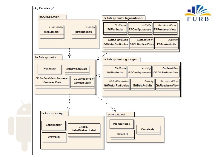 Desenvolvimento • Especificação – Diagramas de Classes • Pacote br. furb. sp. main – Classe inicial básica, activity, tela de informações • Pacote br. furb. sp. string – Auxiliares para desenhar texto no Open. GL ES • Pacote br. furb. sp. util – Utilitários para o Motor de Partículas • Pacote br. furb. sp. motor – Define o framework • • Pacote br. furb. sp. motor. fogosartificio Pacote br. furb. sp. motor. gotaagua