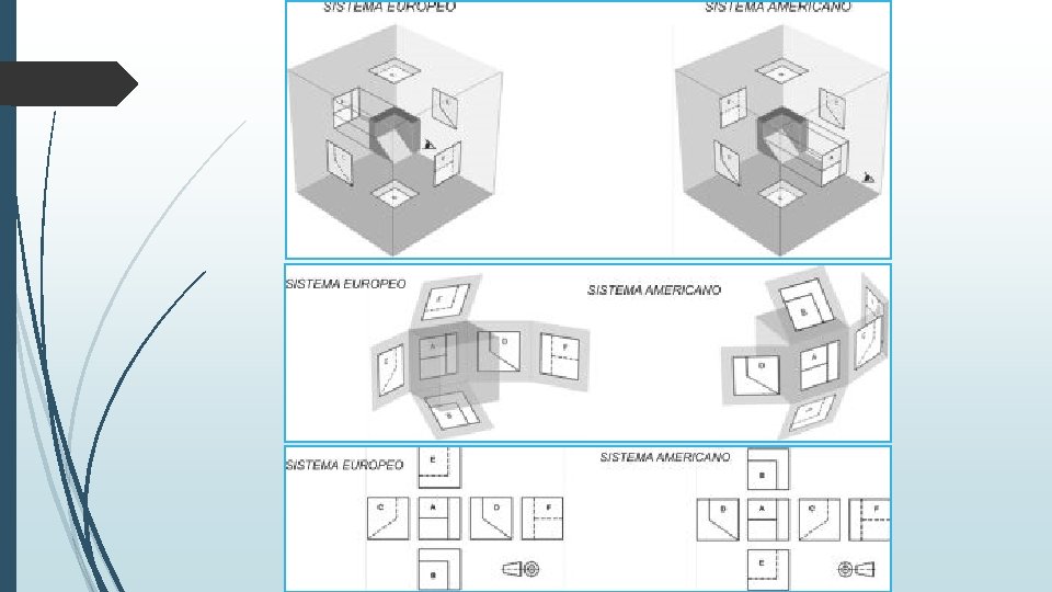 Métodos de Proyección: Primer y Tercer Diedro La diferencia esta en que: En el Sistema Europeo (1 er. Diedro), el objeto se encuentra entre el observador y el plano de proyección. En el sistema Americano (3 er. Diedro), es el plano de proyección el que se encuentra entre el observador y el objeto.