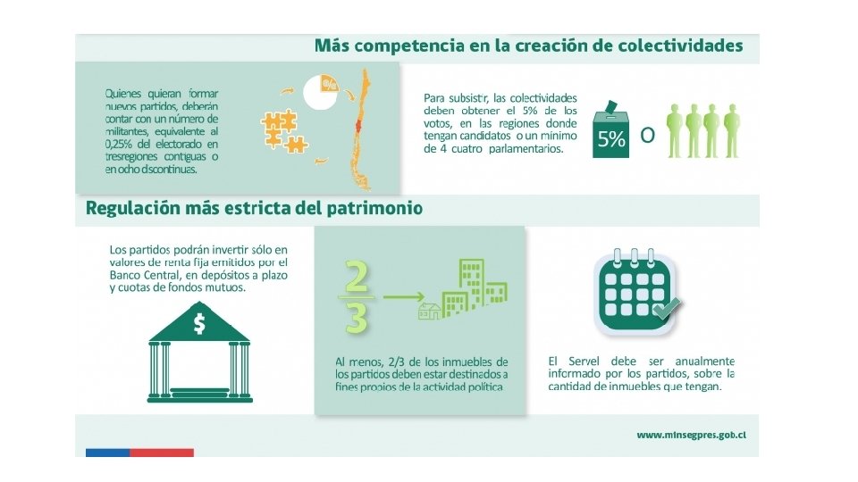 II. PROCESO DE CONFORMACIÓN DE UN PARTIDO POLÍTICO PARA CONSTITUIR UN PARTIDO POLÍTICO ESCRITURA PÚBLICA PUBLICACIÓN EN EL DIARIO OFICIAL 1. A LO MENOS 100 CIUDADANOS CON DERECHO A SUFRAGIO 1. INDIVIDUALIZACIÓN COMPLETA DE LOS INTEGRANTES 2. DECLARACIÓN DE VOLUNTAD 1. DIRECTOR DEL SERVEL PUBLICA EN UN PLAZO DE 5 DÍAS HÁBILES EN EL DIARIO OFICIAL 2. NO PERTENECER A NINGÚN PARTIDO POLÍTICO 3. NOMBRE, SIGLA, LEMA Y DESCRIPCIÓN DEL SÍMBOLO 4. DECLARACIÓN DE PRINCIPIOS Y ESTATUTOS 2. PUBLICACIÓN EN NOTARÍA Y FECHA DE ESCRITURA DE CONSTITUCIÓN DEL PARTIDO POLÍTICO