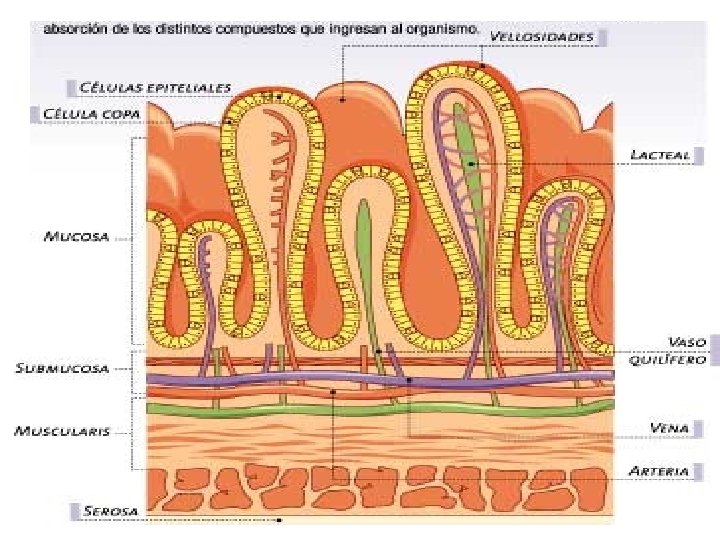 Intestino delgado Longitud de 7 a 8 m. Función: digestión de nutrientes y absorción. Posee vellosidades que absorben los nutrientes. En el duodeno desemboca el conducto del hígado y el conducto pancreático. También en el duodeno se secreta el jugo intestinal