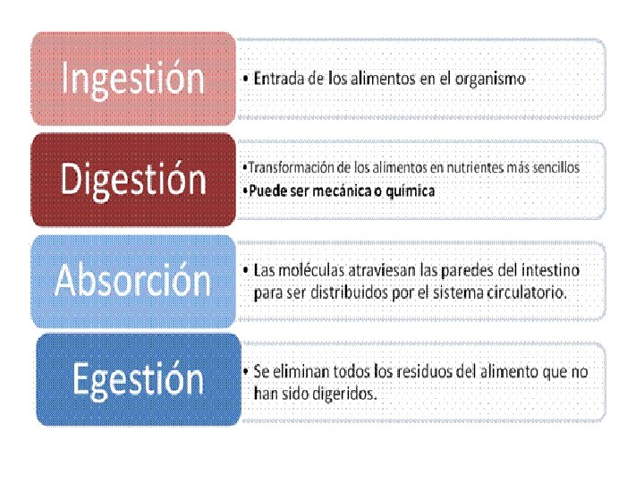 RESUMIENDO - PROCESOS DIGESTIVOS En su recorrido a lo largo del tubo digestivo los alimentos se ven sometidos a los siguientes procesos: INGESTIÓN EGESTIÓN DIGESTIÓN ABSORCIÓN