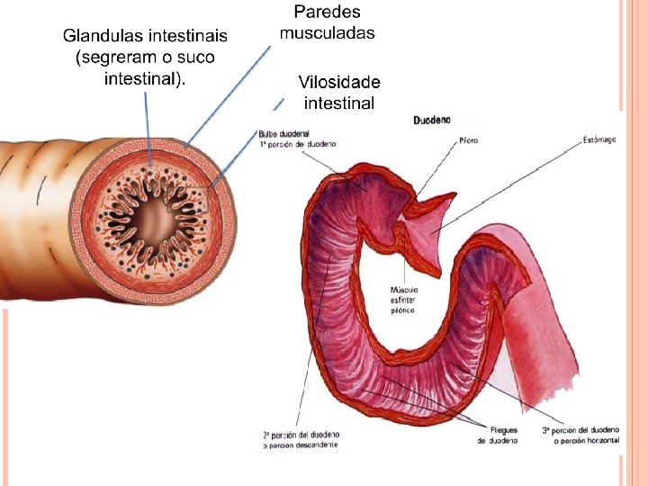 INTESTINO DELGADO O duodeno produz o suco intestinal, que se mistura ao suco pancreático (produzido no pâncreas) e ao suco biliar, produzido no fígado e expulso pela vesícula biliar, para auxiliarem a digestão.