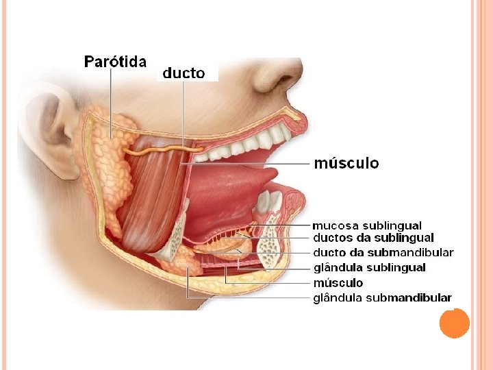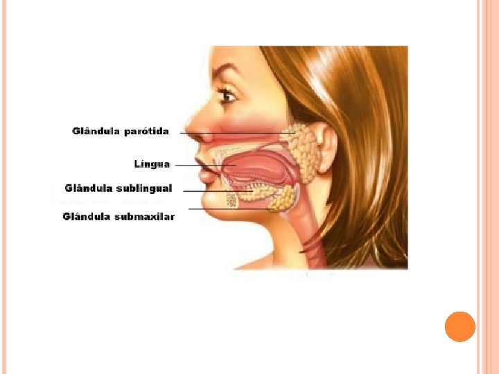 GL NDULAS ANEXAS Glândulas Salivares Estão ao redor da boca e produzem a saliva, um líquido viscoso, claro, sem gosto e sem odor, que contém uma enzima digestiva, a amilase, que decompõe o amido.
