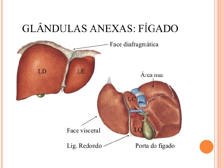 GL NDULAS ANEXAS O fígado é dividido em lobos. A face diafragmática apresenta um lobo direito e um lobo esquerdo, sendo o direito pelo menos duas vezes maior que o esquerdo. A divisão dos lobos é estabelecida pelo ligamento falciforme. Na extremidade desse ligamento encontramos um cordão fibroso resultante da obliteração da veia umbilical, como ligamento redondo do fígado. conhecido