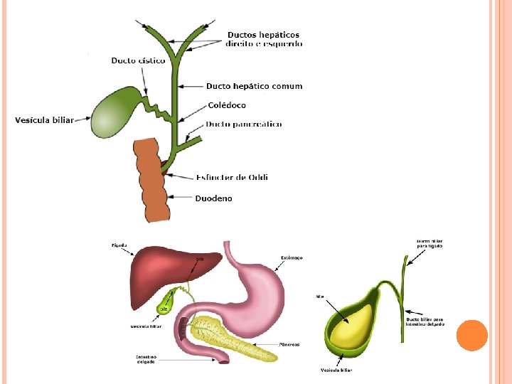 GL NDULAS ANEXAS A bile é um fluido produzido pelo fígado, que fica armazenada na vesícula biliar e atua na digestão de gorduras, de alguns alimentos e na absorção de substâncias nutritivas da dieta ao passarem pelo intestino. Ela é excretada pelo fígado, segue pelos ductos biliares, passa à vesícula, indo ao intestino, onde emulsiona as gorduras. Sua coloração geralmente apresentando uma tonalidade esverdeada. é amarela,