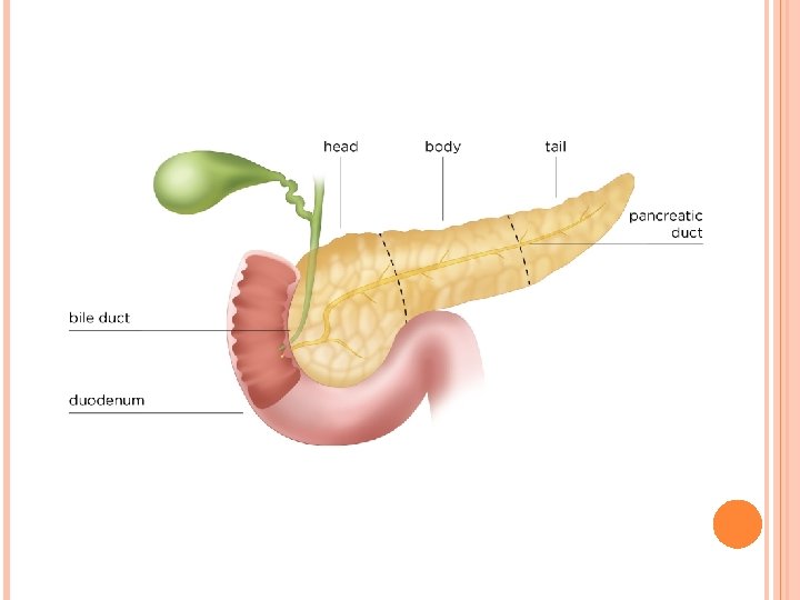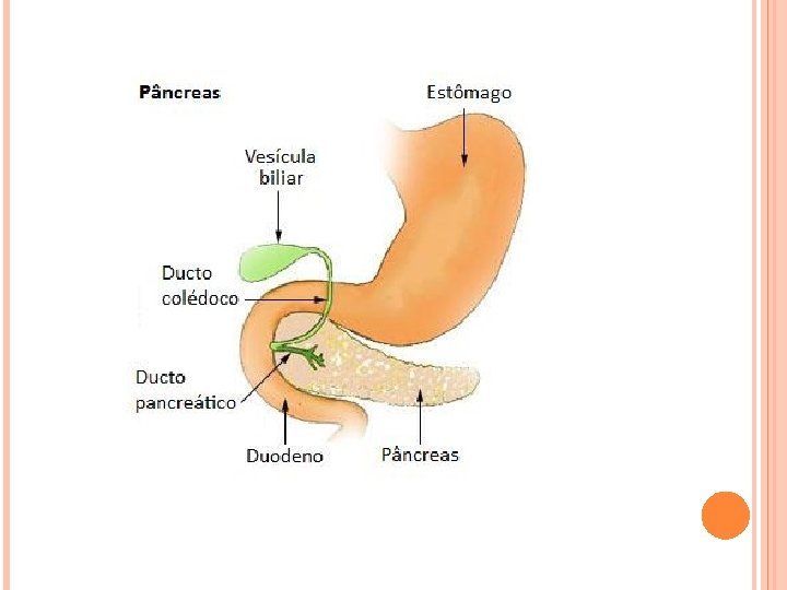 GL NDULAS ANEXAS O sulco pancreático atua no processo digestivo e, através do ducto pancreático é lançado na cavidade do duodeno. Sua secreção digestiva é responsável pela hidrólise da maioria das moléculas de alimento, como carboidratos, proteínas, gorduras e ácidos nucleicos. O p. H do suco pancreático oscila entre 8 e 8, 3. O ducto pancreático principal começa na cauda do pâncreas e corre para sua cabeça, onde se curva inferiormente e está intimamente relacionada com o ducto colédoco.