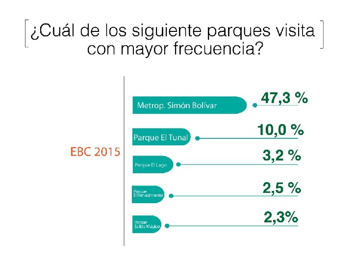 Estándares de m 2 Parque por habitante según escalas de parque Bolsillo + vecinales Parques 2, 4 m 2 Zonales 0, 25 m 2 Metropolitanos 0, 65 m 2 Fuente: Plan Maestro de Parques y Equipamientos Deportivos. 2006 – 2019