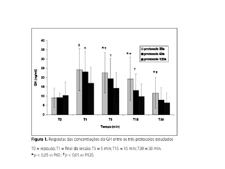 O aumento do cortisol acontece em exercícios submáximos, máximos e supra-máximos. Exercício a 70% do VO 2 máx. Fig. 3. Pre- and post-exercise changes in plasma growth hormone and cortisol concentrations during incremental exercise tests before training (C 1, C 2) and after one (T 1) or three weeks (T 3) of training. Values represent means and SE. Asterisks denote significant differences between pretraining (T 1) and after one or three weeks of training: *p<0. 05; **p<0. 01.