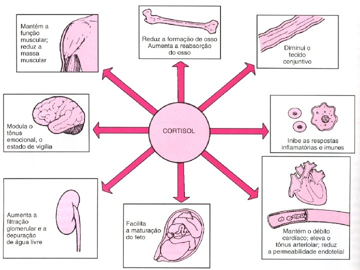 Glicocorticóides √ A adaptação ao estresse; √ A manutenção de níveis de glicose adequados mesmo em períodos de jejum; o estímulo à gliconeogênese √ Mobilização de ácidos graxos livres, fazendo deles uma fonte de energia mais disponível; √ Diminuição da captação e oxidação de glicose pelos músculos para a obtenção de energia, reservando-a para o cérebro, num efeito antagônico ao da insulina; √ Estímulo ao catabolismo protéico para a liberação de aminoácidos para serem usados em reparação de tecidos, síntese enzimática e produção de energia em todas as células do corpo, menos no fígado; √ Atua como agente antiinflamatório; √ Diminui as reações imunológicas, por provocar diminuição no número de leucócitos; √ Aumenta a vasoconstrição causada pela epinefrina; √ Facilita a ação de outros hormônios, especialmente o glucagon e a GH, no processo da gliconeogênese