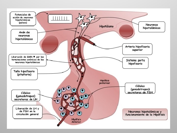 Adenohipofisis • Hormona somatotrópica (S. T. H: ) u hormona del crecimiento (G. H. ): estimula el crecimiento corporal por el efecto anabólico que ejerce sobre la síntesis de proteínas estructurales; también estimula el crecimiento de los huesos e influye en el metabolismo de los carbohidratos - hormona tiroestimulante (T. S. H. ): controla la función de la glándula tiroidea y, por consiguiente, los niveles circulantes de tiroxina. - Hormona adrenocorticotrópica (A. C. T. H: ): controla la función de la corteza suprarrenal, específicamente la liberación de glucocorticoides. - Hormona foliculoestimulante (F. S. H): en la mujer estimula la maduración de los folículos ováricos y en el hombre la función espermatogénica de los túbulos seminíferos. - Hormona luteinizante (L. H. ): en la mujer promueve la ovulación y la formación y mantenimiento del cuerpo lúteo y en el hombre estimula la formación y liberación de andrógenos por parte de las células intersticiales de Leydig o endocrinocitos intersticiales. - Hormona lactotrópica (L. T. H. ) o prolactina: estimula el desarrollo de las glándulas mamarias y la producción de leche. - Hormona melanoestimulante (M. S. H. ): estimula la producción del pigmento de la piel, la melanina, por parte de los melanocitos.