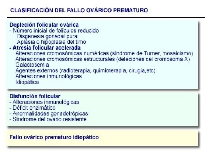 Hipofunción ovárica • Es una de las causas más comunes de la infertilidad femenina, así como la causa más común de amenorrea secundaria en mujeres menores de 40 años. Se trata de un desorden genético que puede ser debido a varias causas, entre las que encontramos un origen cromosómico, defectos enzimáticos, quimioterapia y radioterapia, origen autoinmune, origen infeccioso y secreción o acción anormal de FSH y LH. Sin embargo, la principal de ellas es una muy baja o nula expresión de las proteínas receptoras de la hormona FSH (FSHR), lo cual genera anomalías en el desarrollo y maduración del folículo debido a una interacción inadecuada entre dicha hormona y su receptor.