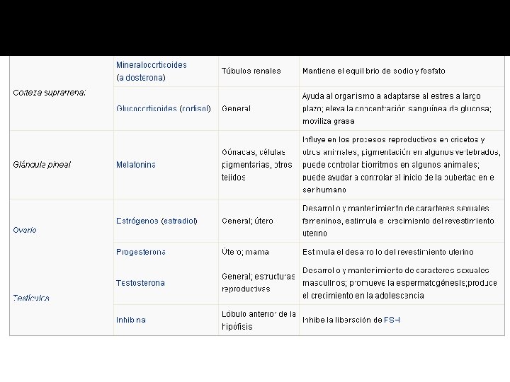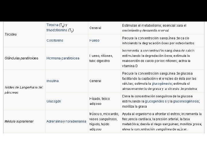 CARACTERÍSTICAS Actúan sobre el metabolismo Se liberan al espacio extra celular Viajan a través de la sangre Afectan tejidos que pueden encontrarse lejos del punto de origen de la hormona Su efecto es directamente proporcional a su concentración Independientemente de su concentración, requieren de adecuada funcionalidad del receptor, para ejercer su efecto. Regulan el funcionamiento del cuerpo