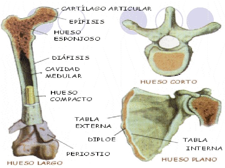 l Hay varios tipos de huesos : Largos, como los del brazo o la pierna. l Cortos, como los de la muñeca o las vértebras l Planos, como los de la cabeza
