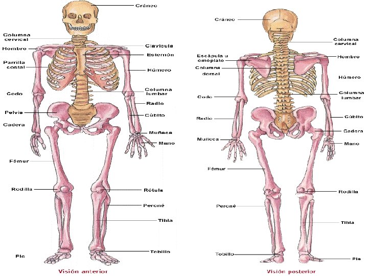 Las funciones básicas de los huesos y esqueleto son: l Soporte: los huesos proveen un cuadro rígido de soporte para los músculos y tejidos blandos. l Protección: los huesos forman varias cavidades que protegen los órganos internos de posibles traumatismos. Por ejemplo, el cráneo protege el cerebro frente a los golpes, y la caja torácica, formada por costillas y esternón protege los pulmones y el corazón.