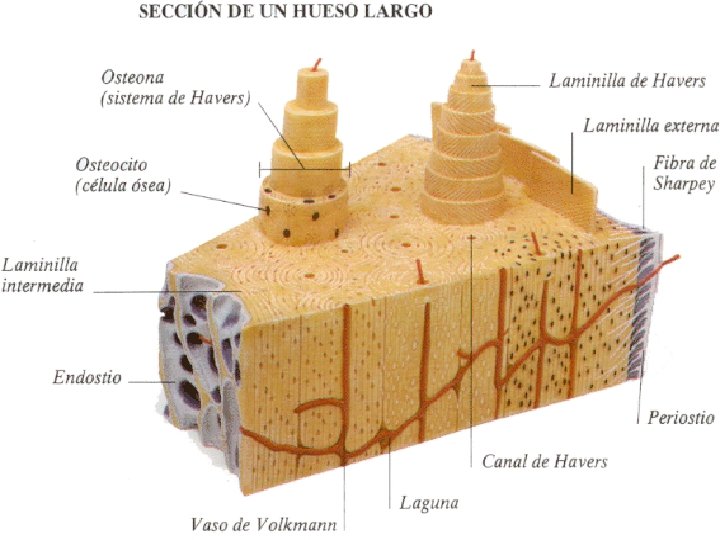 l Algunas l Son características de los huesos: duros. l Están formados por una sustancia blanda llamada osteína y por una sustancia dura formada por sales minerales de calcio y fósforo. l Los huesos largos tienen en su parte media un canal central relleno de médula amarilla, y las cabezas son esponjosas y están llenas de médula ósea roja.