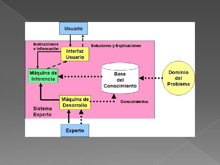 Un sistema experto se compone de: �Base de hechos �Base de conocimientos �Motor de inferencia �Módulos de comunicación o de entrada-salida que se subdivide en: �Módulo de consulta o del usuario �Módulo de trabajo o del experto