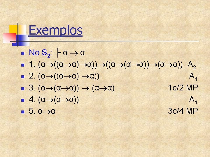 Exemplos n Padrões que foram usados na derivação ├ α α no S 2 : n Em 1 e 2 os axiomas A 2 e A 1, com o padrão: =α =α n Em 4 usamos o axioma A 1 com o padrão: =α =α
