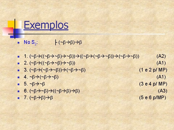 Exemplos 2 - Prove ├ (~ ) para qualquer No S 1: 1. | ~ 2. | | ~ 3. | | 4. | | ~ ^ 5. | ~~ 6. | 7. (~ ) H (p/ PC) H (p/ RAA) 1, 2 MP 2, 3 ^I 1 -4 RAA 5 ~E 1 -6 PC