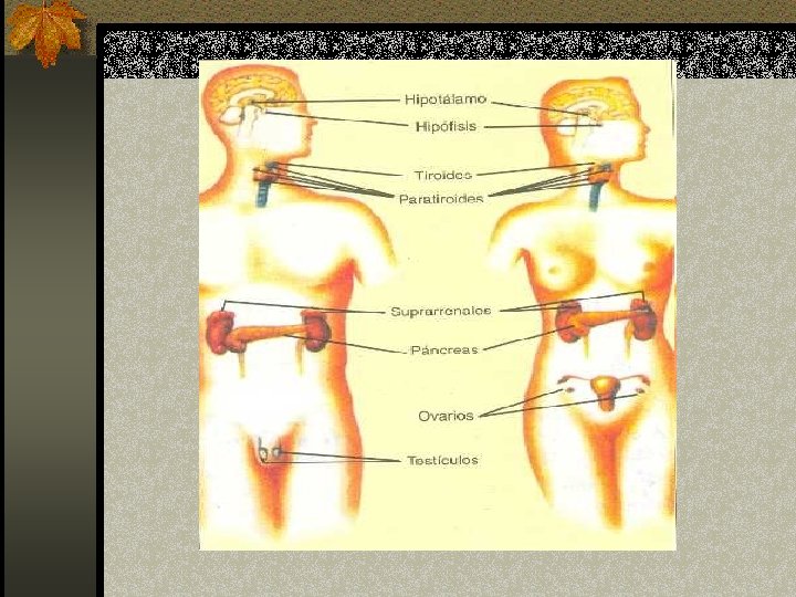 n Hipotálamo: n n n n n TRH Adenohipófisis: TSH, ACTH, FSH, LH, PRL Neurohipófisis: ADH, Oxitocina Tiroides: Calcitonina Páncreas: Insulina, Glucagon Paratiroides: PTH Riñón: Renina, Eritropoyetina Corazón: ANP Estómago: Gastrina Intestino Delgado: Secretina, Colecistocinina Placenta: h. CG, Somatotropina