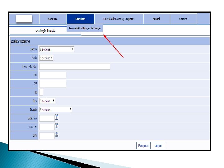 ◦ Consulta – Dados da Gratificação de Função �O sistema, também oferece a funcionalidade de consultar os eventos, com relação as incorporações de décimos nos termos da Lei Complementar nº 1018/2007, para tanto, basta preencher o(s) campo(s) e clique em pesquisar. � Esclarecemos, que não há necessidade de preenchimento de todos os campos, bastando inserir o número do RG ou CPF + DI e clicar em “pesquisar”