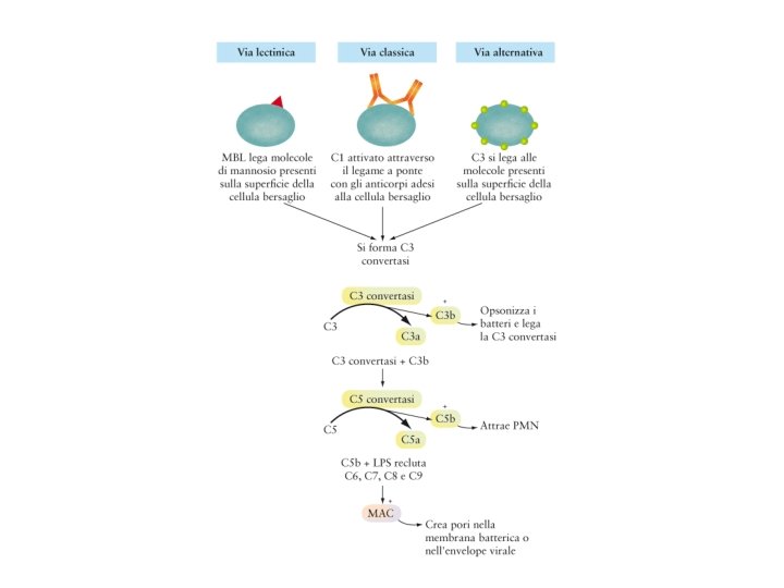 Benefici di C 5 a e C 3 b Alcuni C 3 b si legano agli antigeni di superficie dei microbi. Alcuni C 3 b si combinano con C 2 a e C 4 b e formano un terzo enzima del pathway del complemento che è in grado di scindere C 5 in C 5 a e C 5 b. C 5 a stimola i mastociti a rilasciare istamina per 36 l’infiammazione e la diapedesi o stimola la fagocitosi.