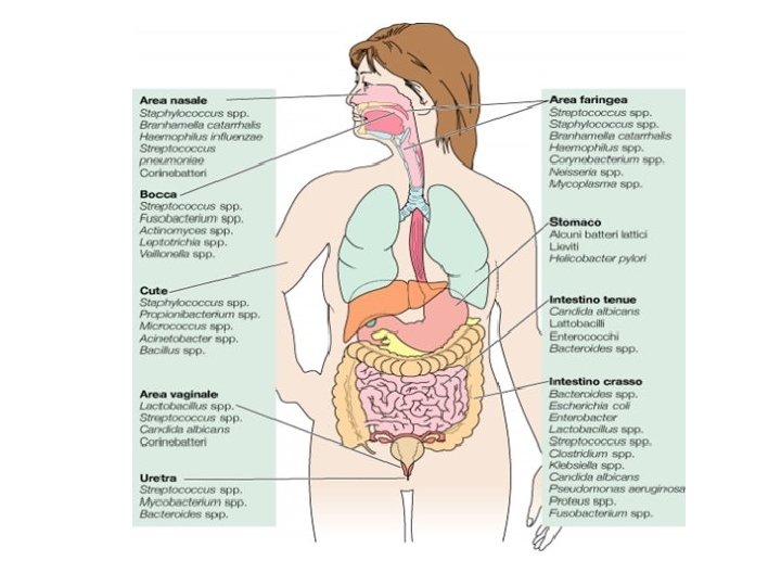 Antagonismo batterico della normale flora • 1. 2. 3. 4. Circa 3 x 1014 batteri e altri microrganismi risiedono nel corpo umano, questa normale flora batterica inibisce la colonizzazione dei patogeni con: La produzione di metaboliti che inibiscono la crescita di molti patogeni Aderiscono alle cellule dell’ospite prevenendo la colonizzazione di microrganismi patogeni Utilizzano nutrienti essenziali per la crescita dei patogeni Stimolano in modo non specifico il sistema immunitario 10
