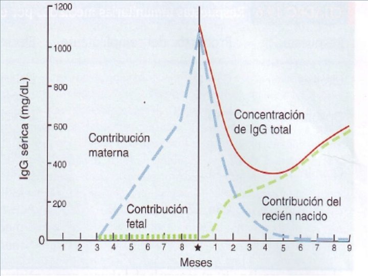 SISTEMA INMUNE CARACTERISTICAS RELEVANTES DE LAS INMUNOGLOBULINAS. Inmunoglobulina G: A. B. C. D. E. Predomina en la sangre, en la linfa, en el liquido cefalorraquídeo y peritoneal. Corresponde al 70% de los anticuerpos séricos y al 15% de las proteínas. Contiene 4 subclases, designadas Ig. G 1, Ig. G 2, Ig. G 3, e Ig. G 4. Exceptuando la Ig. G 3 con recambio rápido de 7 días, la vida media de este isotipo es de 21 días. Es la única capaz de atravesar la placenta transfiriendo la inmunidad materna al feto.