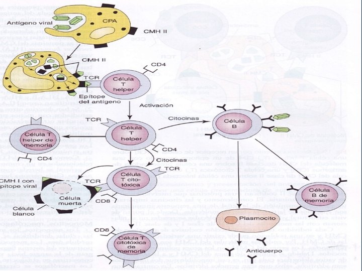 FORMACION DE LINFOCITOS B DE MEMORIA Y LA RESPUESTA SECUNDARIA § Algunos linfoblastos formados por la activación de un clon de linfocitos B no forman células plasmáticas sino un numero moderado de linfocitos B nuevos similares al del clon original § La población de linfocitos B del clon activado de forma especifica aumenta mucho , y se añaden nuevos linfocitos B a los linfocitos originales del mismo clon § Circulan a través del cuerpo para poblar todo el tejido linfático, . Desde un punto de vista inmunológico permanecen durmientes hasta que una nueva cantidad del mismo antígeno los activa § Se llaman linfocitos de memoria y son la base de la respuesta inmune secundaria