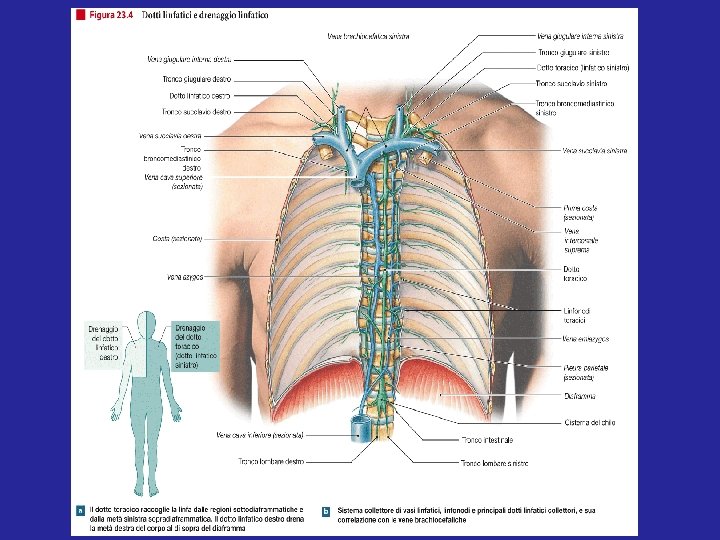 SCHEMA DEL SISTEMA CIRCOLATORIO LINFATICO La LINFA recuperata nei fluidi intersitziali dai CAPILLARI LINFATICI viene veicolata tramite un sistema di vasi di calibro via maggiore ai due grossi vasi linfatici denominati: - DOTTO TORACICO per la linfa della PARTE SOTTODIAFRAMMATICA del CORPO e della PARTE SOPRADIAFRAMMATICA SINISTRA; - GRANDE VENA LINFATICA DESTRA (o DI GALENO) per la PARTE SOPRADIAFRAMMATICA DESTRA La LINFA vene così trasferita nel torrente sanguifero a livello delle VENE ANONIME Sinistra e Destra, dove confluisco in due grossi vasi linfatici sopra menzionati